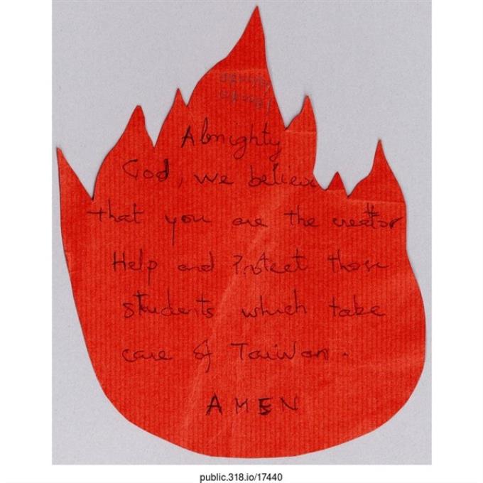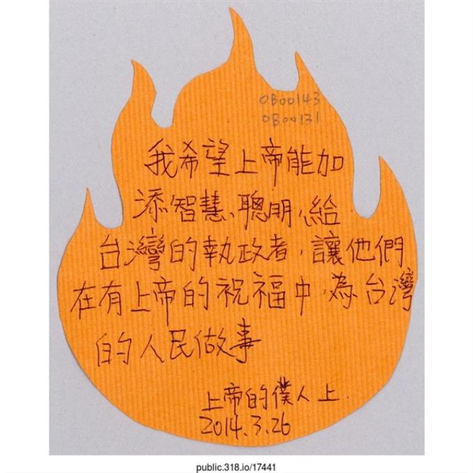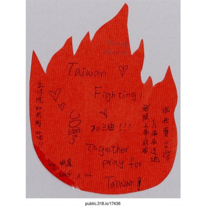 「謝謝台灣有你們這群勇敢守護台灣的青年!」葉片型紙片