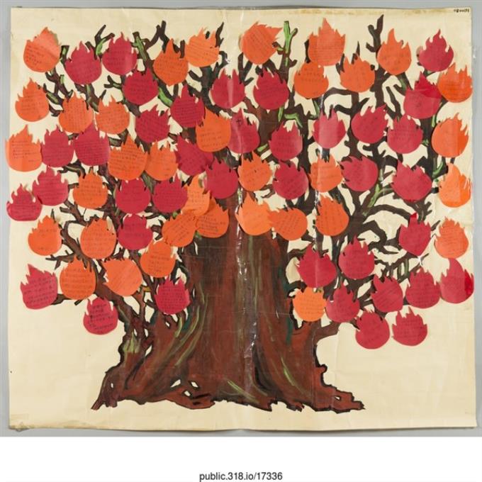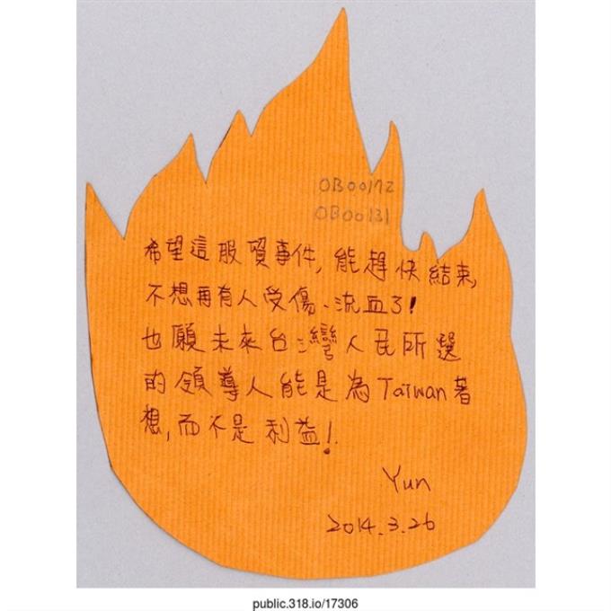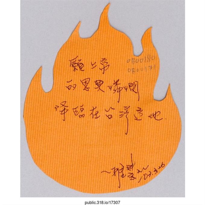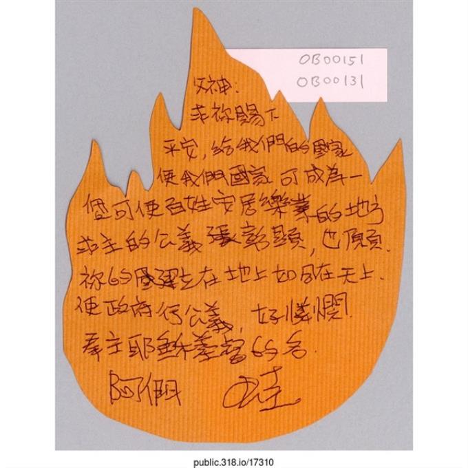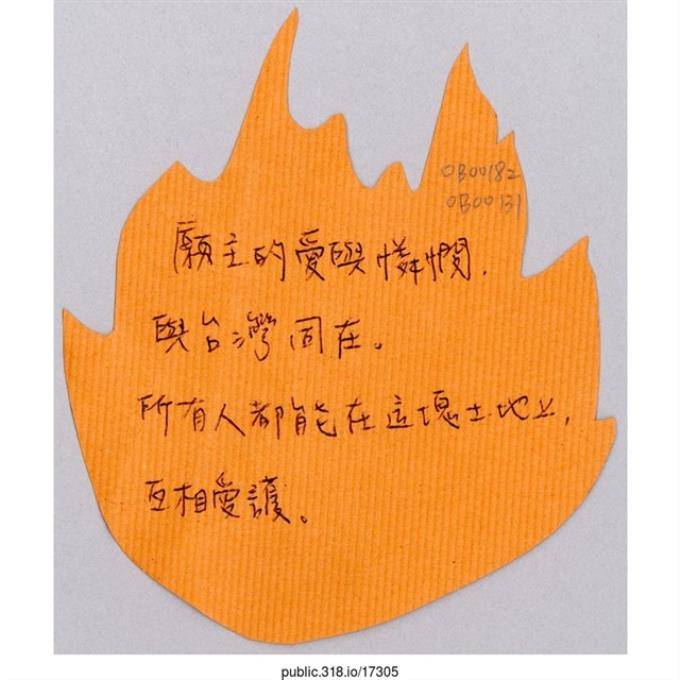 「願主的愛與憐憫與台灣同在。」葉片型紙片