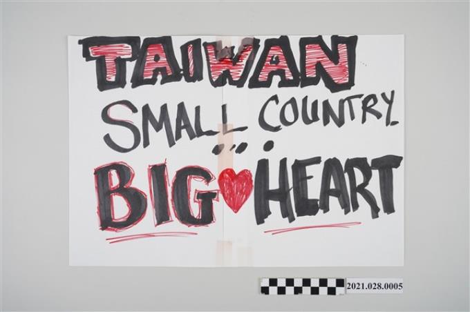 手寫「TAIWAN SMALL COUNTRY… BIG HEART」的文宣