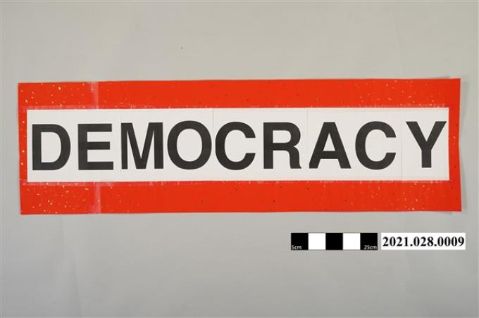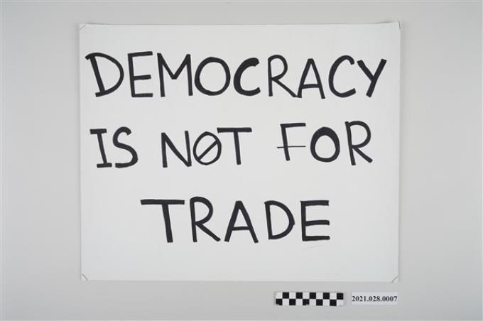 手寫「DEMOCRACY IS NOT FOR TRADE」的文宣