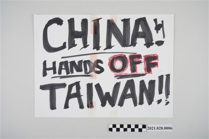 手寫「CHINA!!HANDS OFF TAIWAN!! 」的文宣