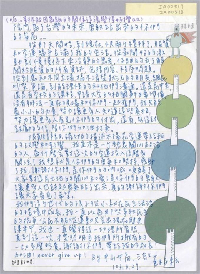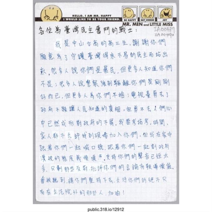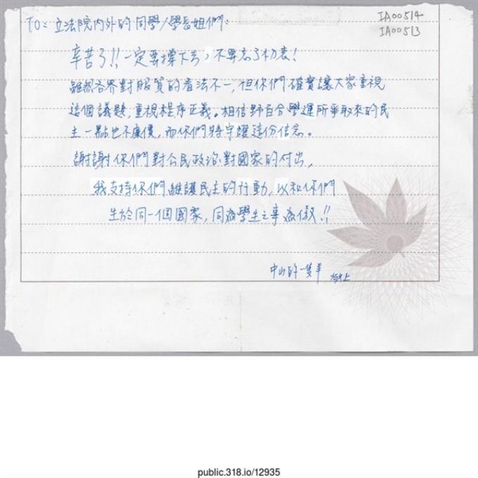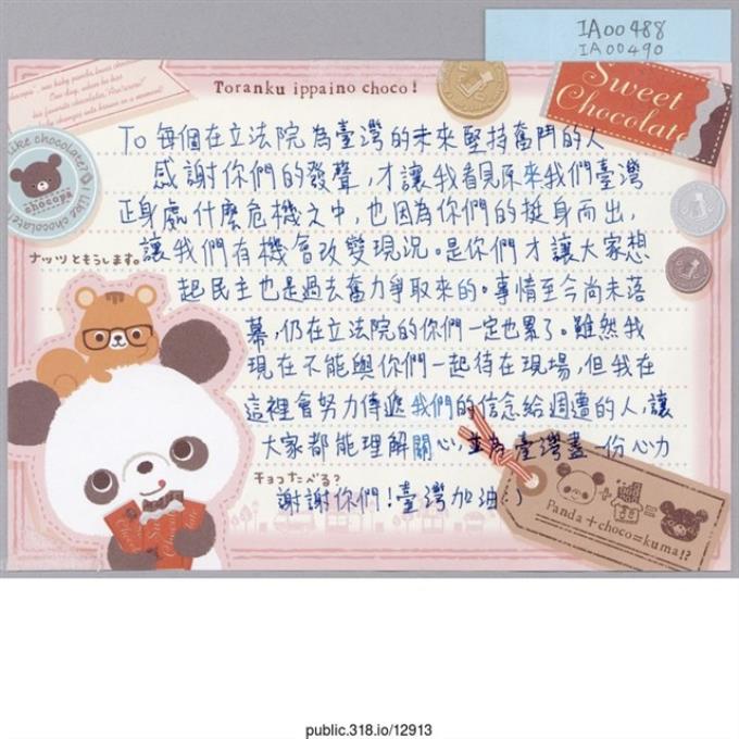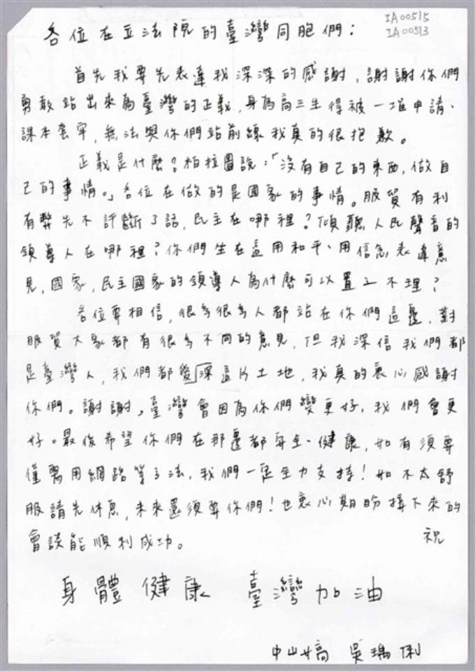 「To每個在立法院為台灣的未來堅持奮鬥的人」信件