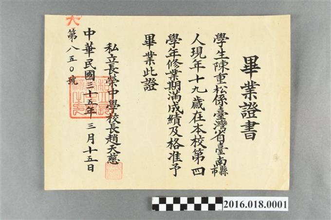 陳重松私立長榮中學校畢業證書