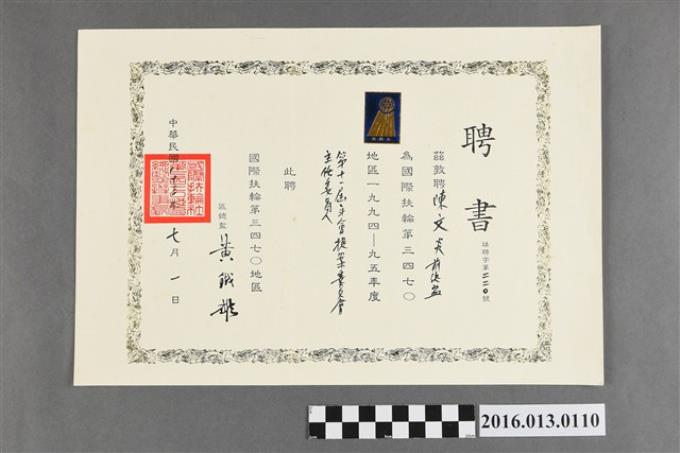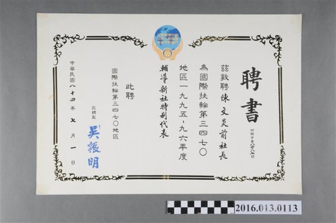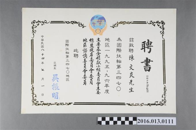陳文炎任國際扶輪社第三四七O地區1995-96年度資格審查委員會主委之聘書