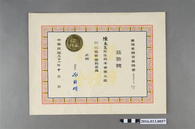 陳文炎任臺灣省體育會田徑協會第九屆常務委員聘書