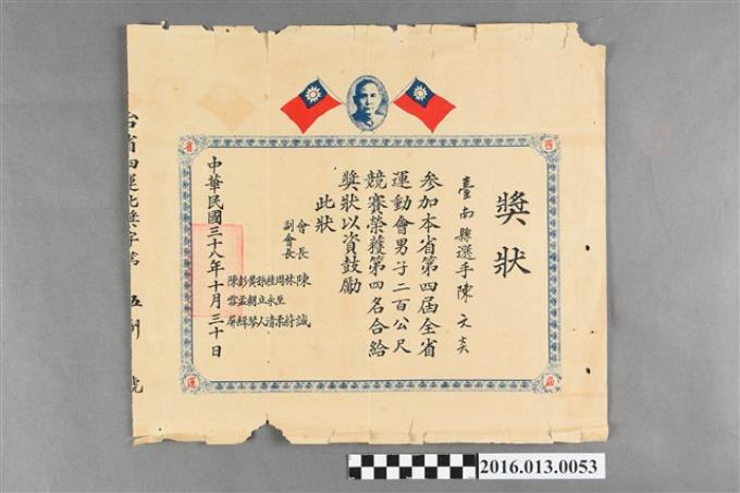 陳文炎臺灣省第二屆全省運動大會400公尺優勝獎狀