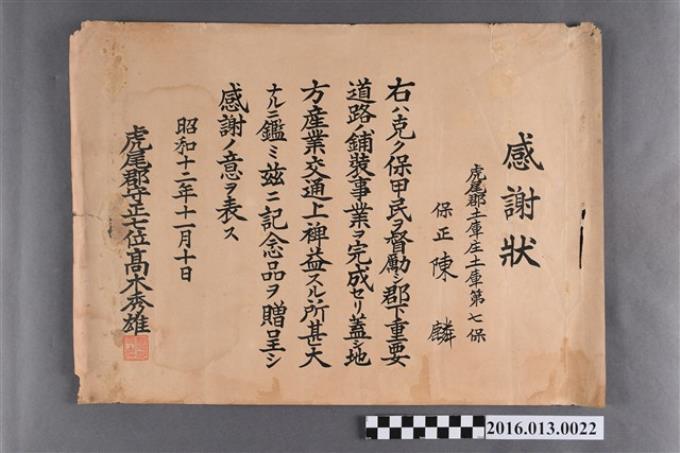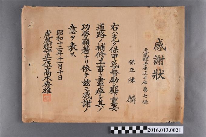 昭和十二年陳麟監督土庫庄道路鋪設整修作業致贈紀念品感謝狀