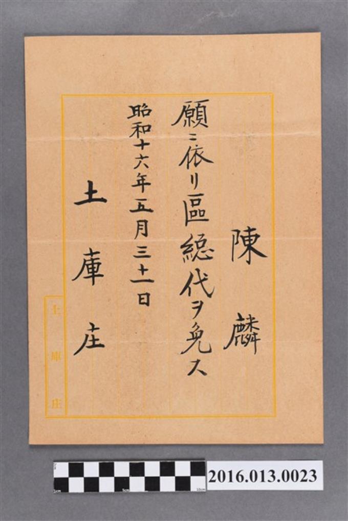 陳麟土庫庄區總代任命書