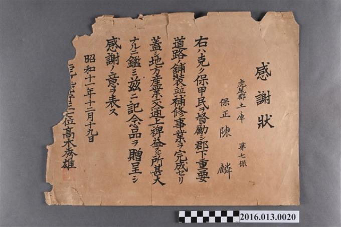 昭和十一年陳麟監督土庫庄道路鋪設整修作業致贈紀念品感謝狀