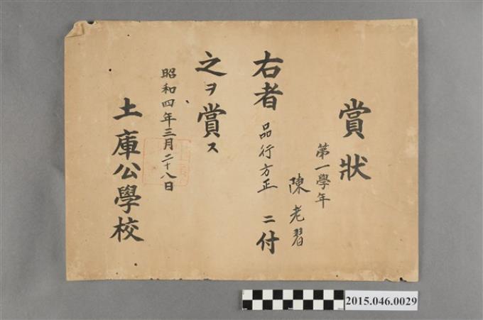陳老習土庫公學校第一學年品行方正獎狀