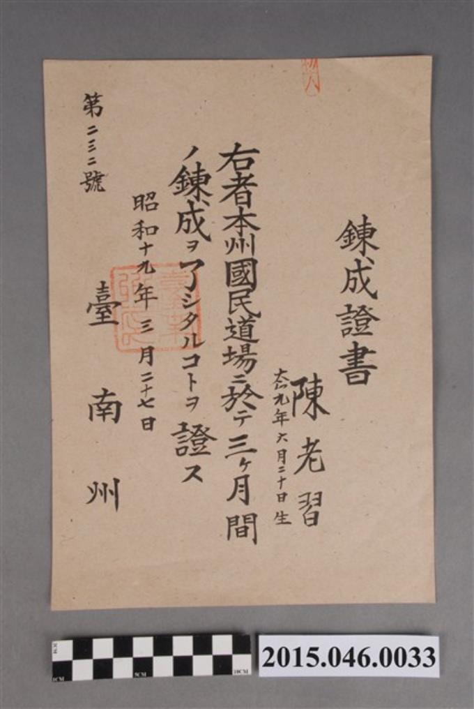 陳老習臺南州國民道場鍊成證書