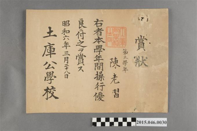 陳老習土庫公學校第三學年操行優良獎狀
