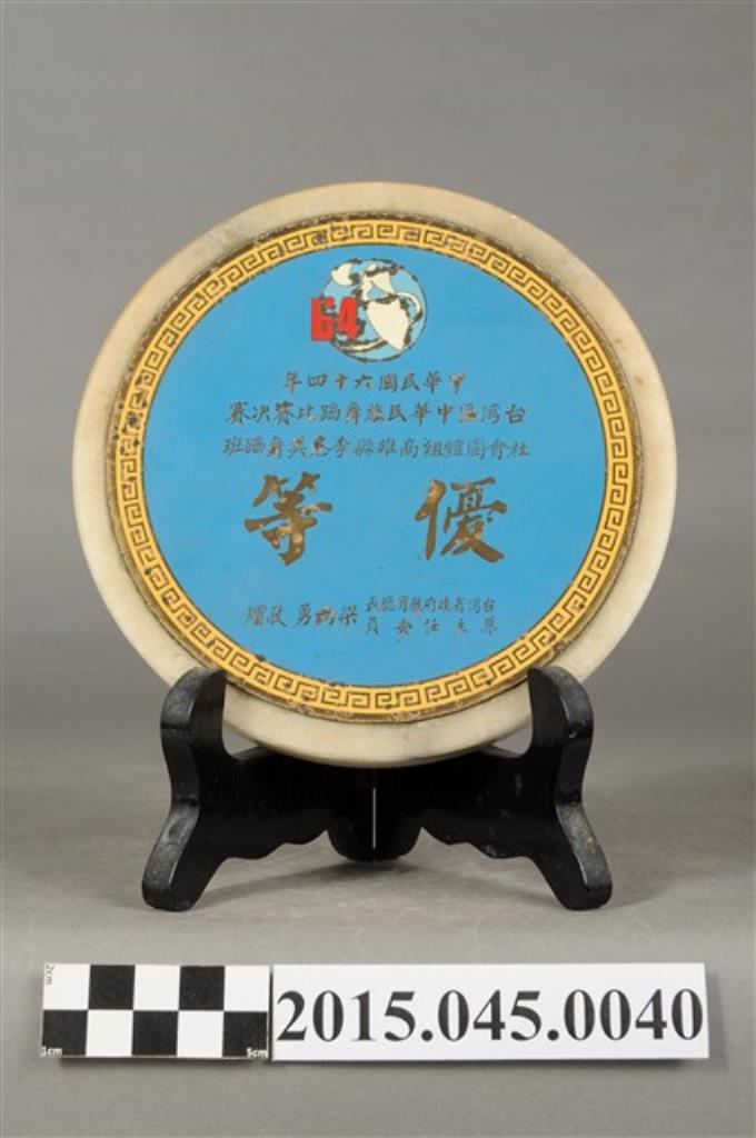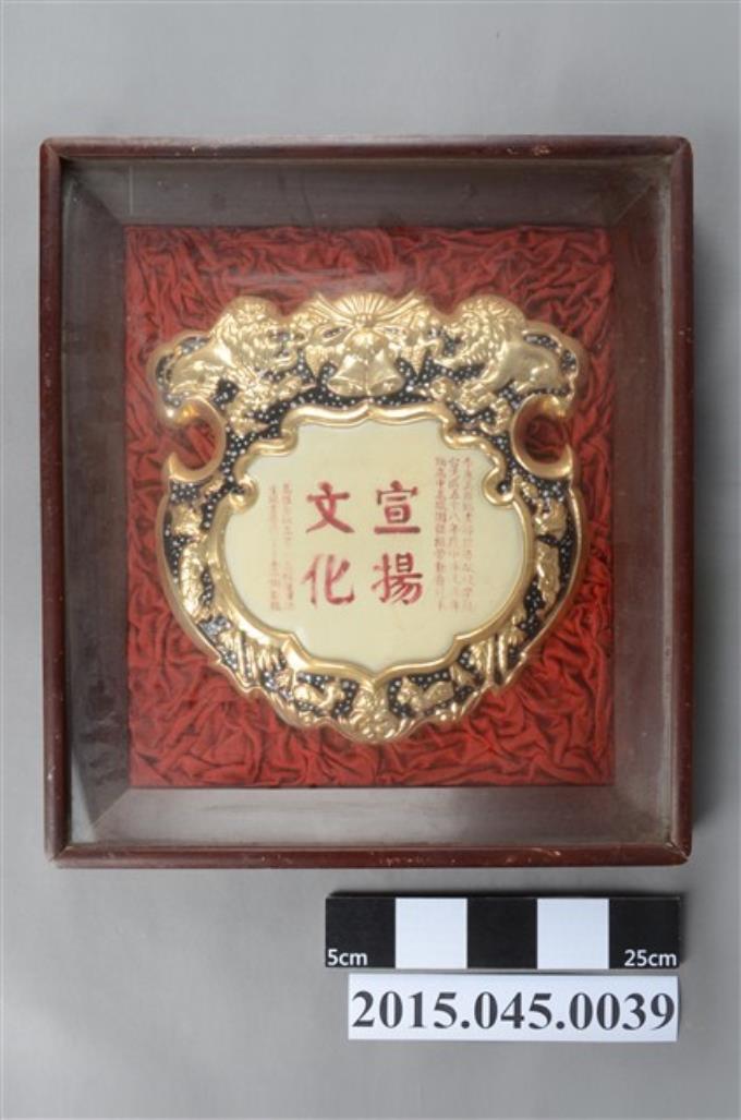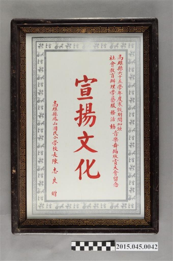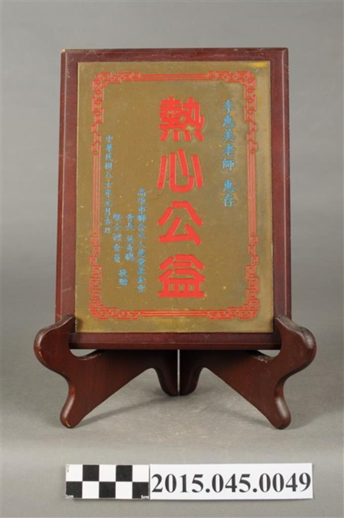 高雄縣鳳山國民小學校長陳志良表彰李惠美辦理六十五年度加強社會教育學藝服務活動音樂舞蹈欣賞大會獎牌
