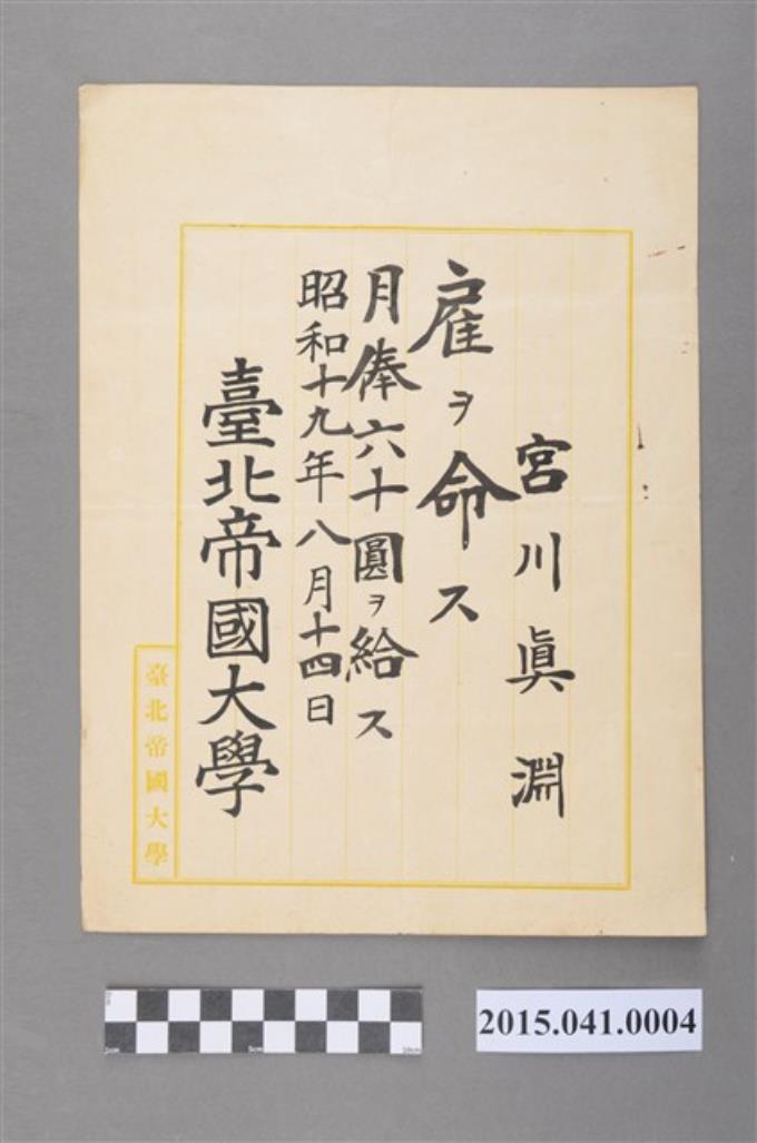 邱如淵先生臺北帝國大學雇員職務任命書