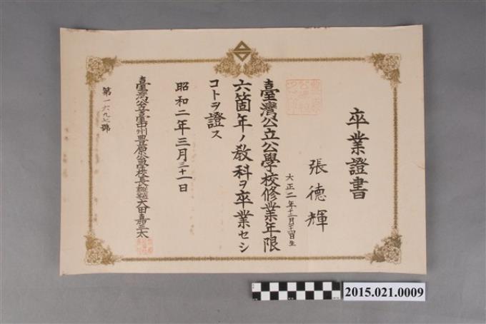 張德輝昭和2年3月31日臺灣公立臺中州豐原公學校畢業證書