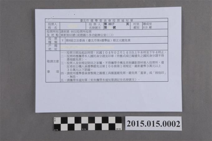 第8屆立法委員(臺北市第4選舉區)蔡正元罷免案投票通知單