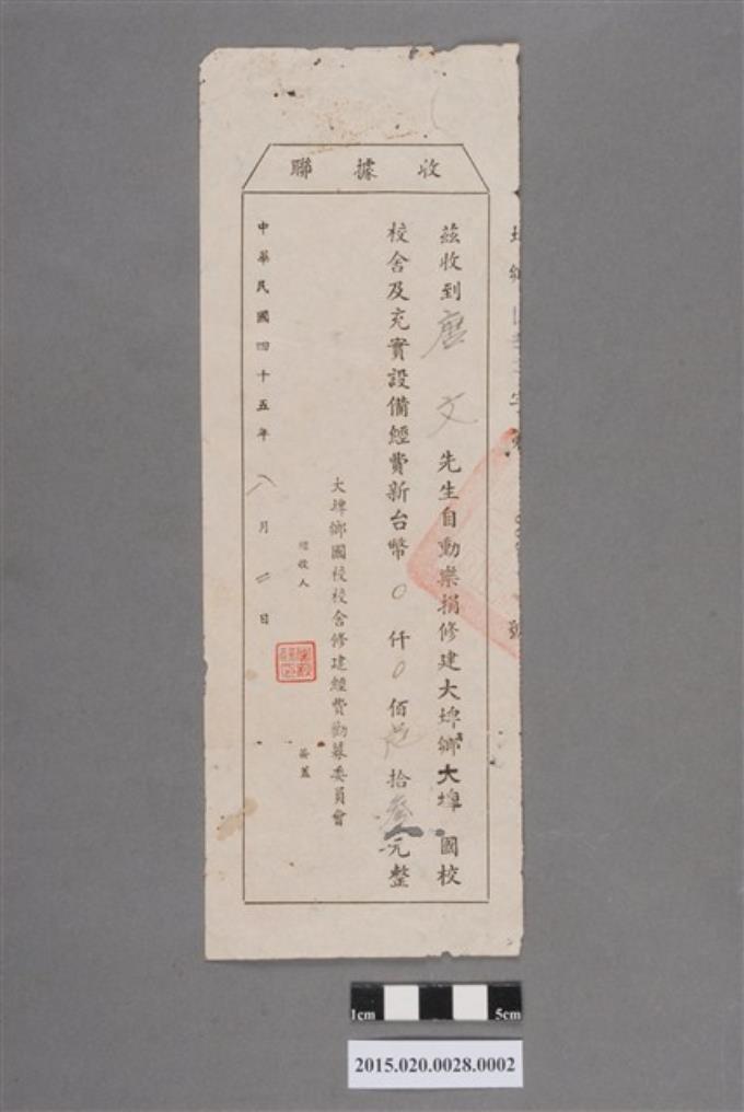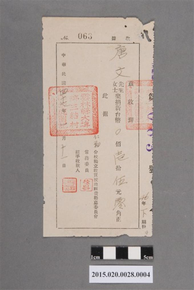大埤鄉國校校舍修建經費勸募委員會給唐文樂捐收據