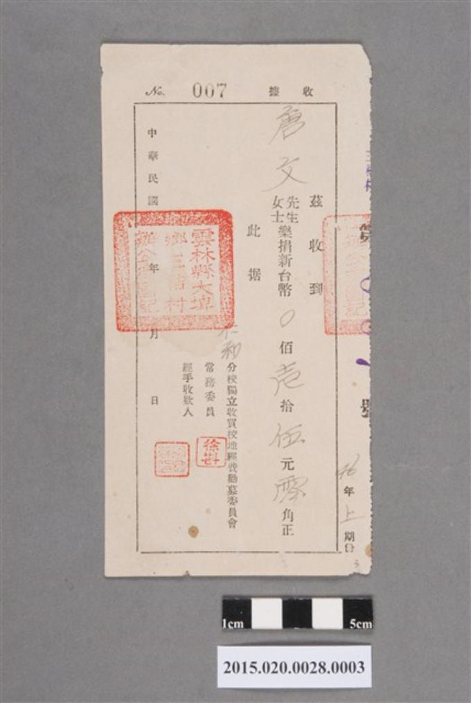 仁和分校獨立收買校地經費勸募委員會給唐文樂捐收據
