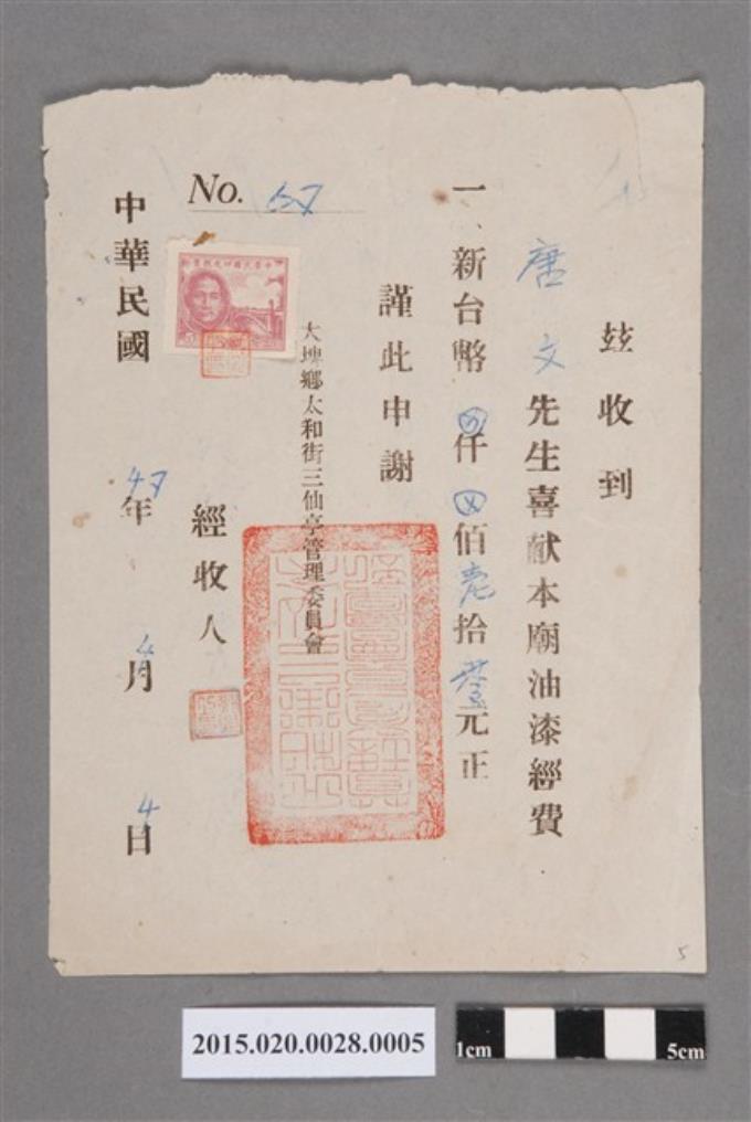 大埤鄉太和街三仙亭管理委員會給唐文捐獻寺廟油漆經費收據