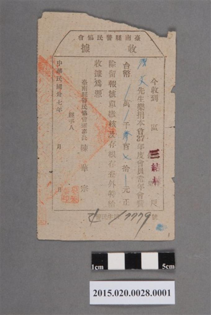 臺南縣警民協會給唐文捐款收據