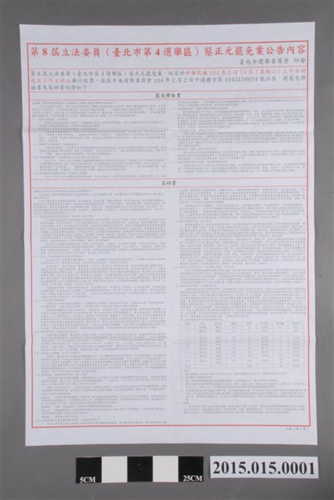 第8屆立法委員(臺北市第4選舉區)蔡正元罷免案選舉公報