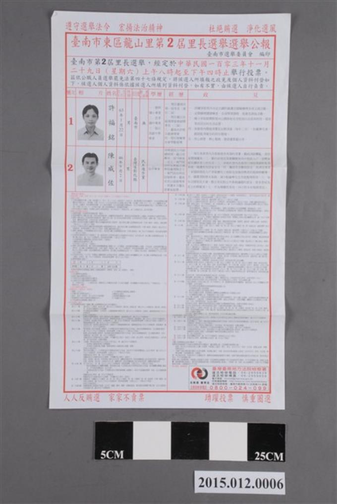 臺南市選舉委員會編印臺南市東區龍山里第2屆里長選舉選舉公報