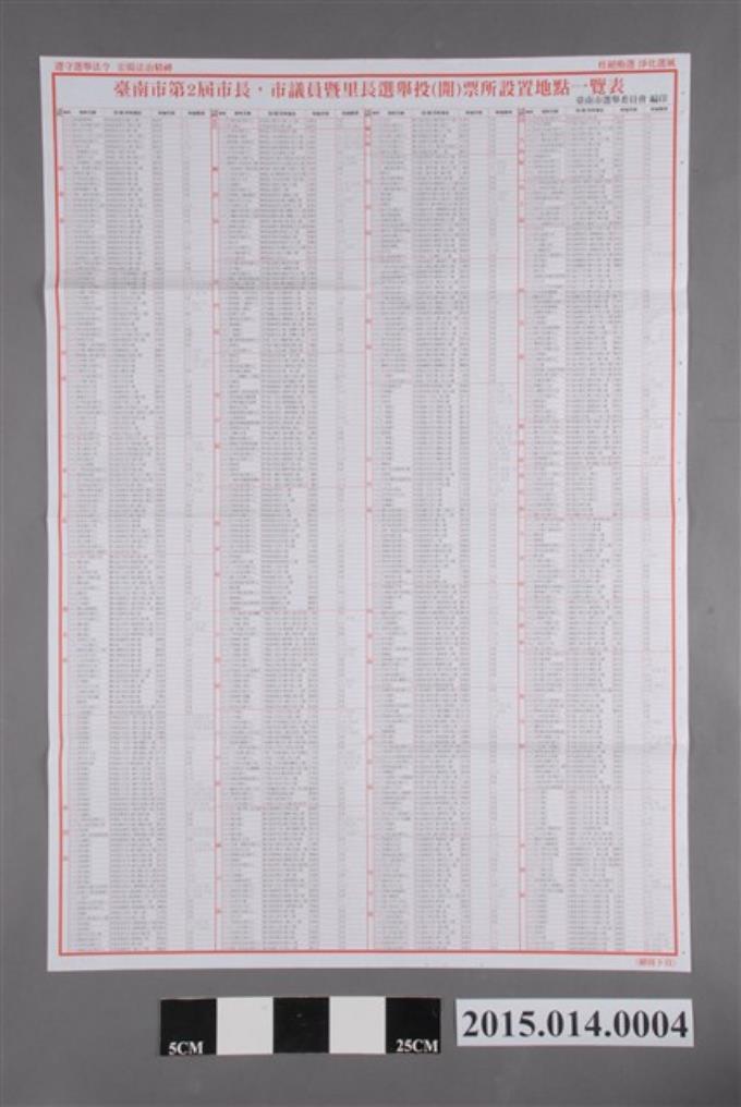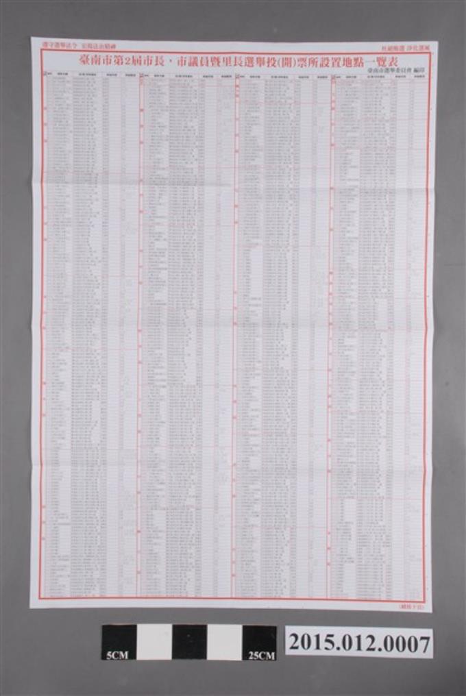 臺南市選舉委員會編印臺南市第2屆市長、市議員暨里長選舉投(開)票所設置地點一覽表