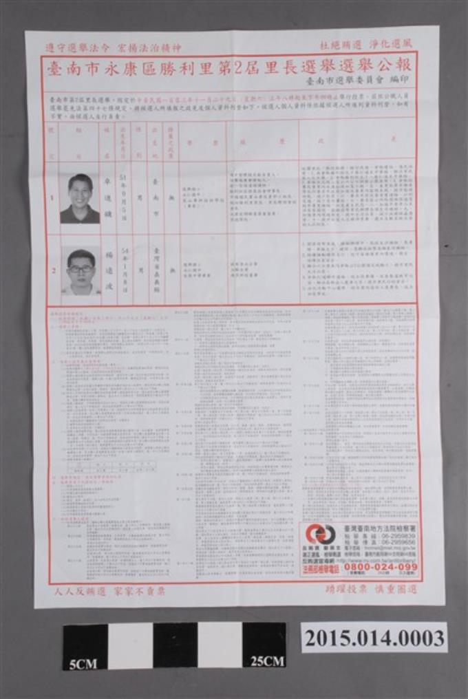 臺南市選舉委員會編印臺南市永康區勝利里第2屆里長選舉公報
