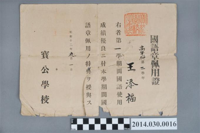 王添福昭和12年寶公學校高等科第2學年第1學期國語章佩用證