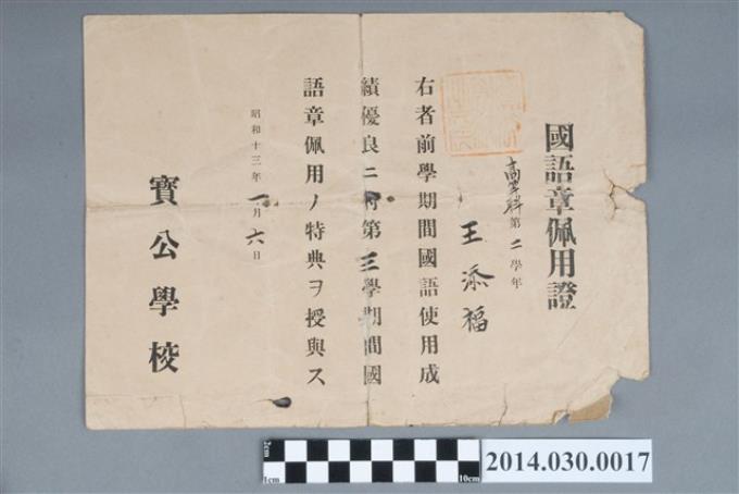 王添福昭和13年寶公學校高等科第2學年第3學期國語章佩用證