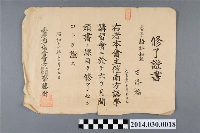 王添福昭和17年臺灣南方協會初級菲律賓他加祿語研習結業證書