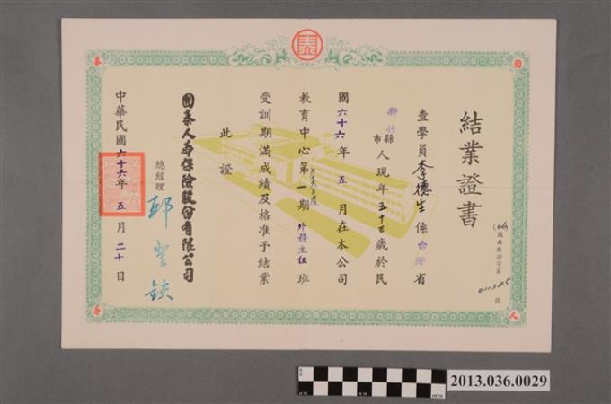 李德生保險業務訓練外務主任班結業證書(民66.5.20)