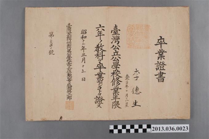 李德生新竹第一公學校卒業證書(昭和13年3月15日)