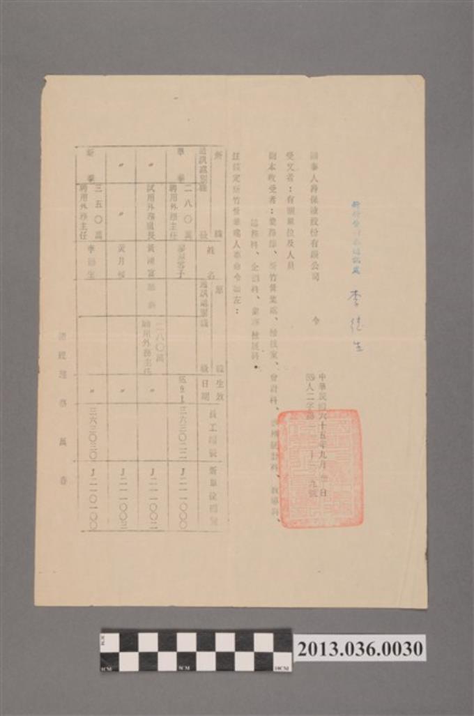 李德生保險從業員敘薪資料(民65.9.30)