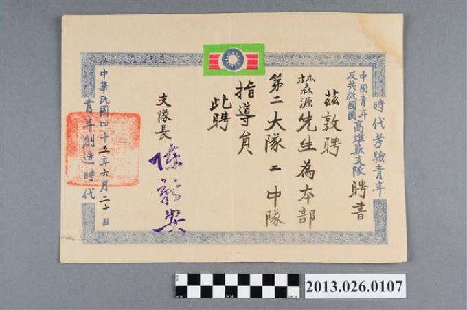 1956年6月20日中國青年反共救國團高雄縣支隊聘林森源為本部第二大隊二中隊指導員聘書