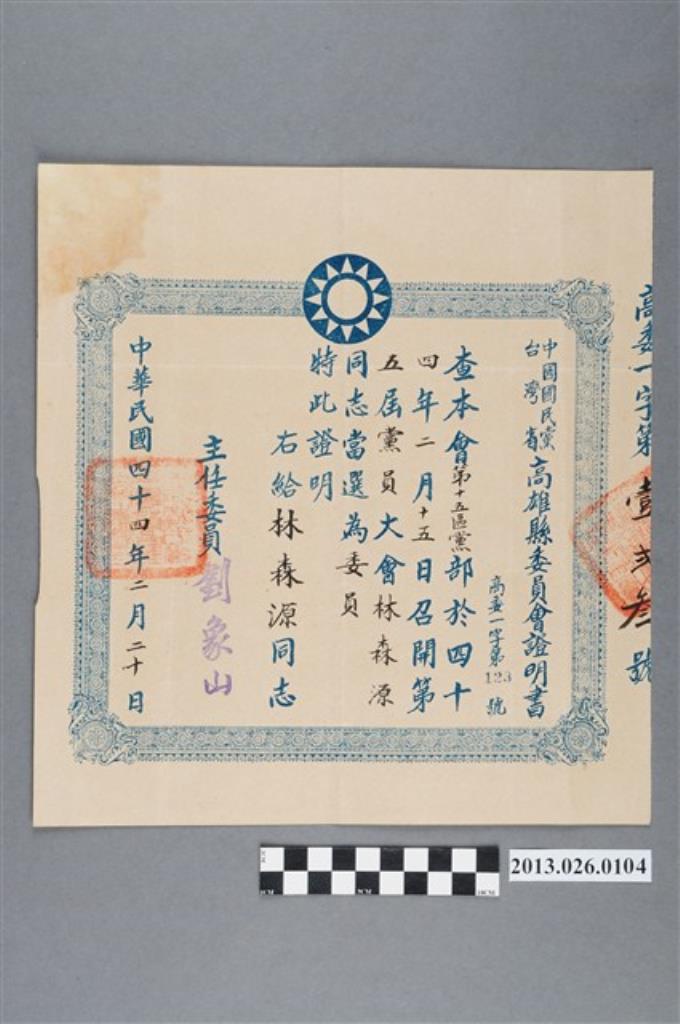 1955年2月20日中國國民黨台灣省高雄縣委員會給予林森源當選為委員證明書