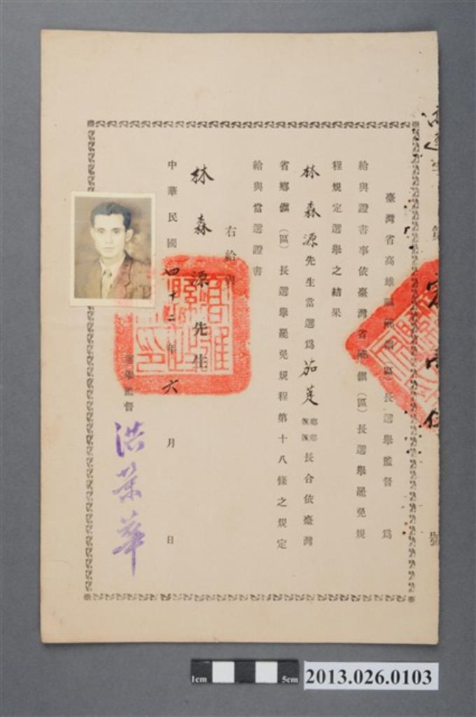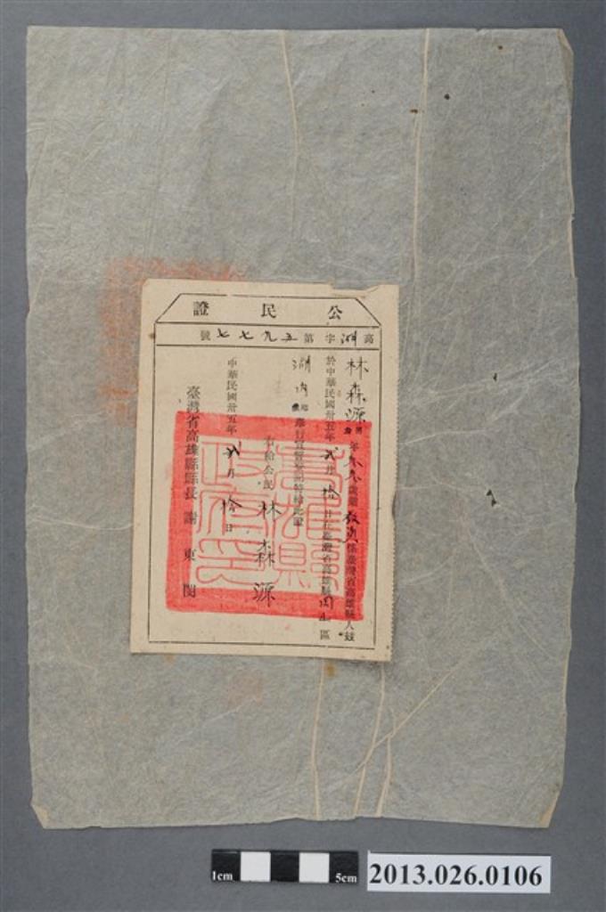 1946年2月10日林森源在台灣省高雄縣岡山區湖內鄉舉行宣誓登記公民證
