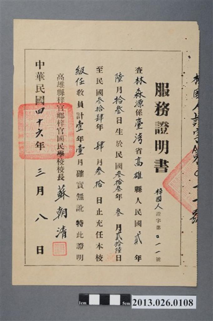 1957年3月8日林森源充任高雄縣梓官鄉梓官國民學校級任教員服務證明書