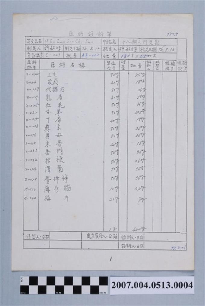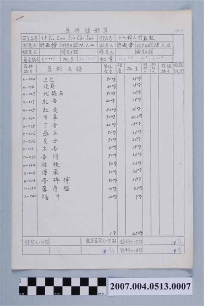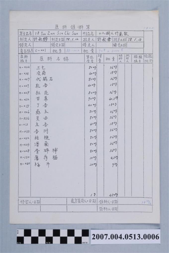 十八銅人行氣散原料領料單78年4月13日