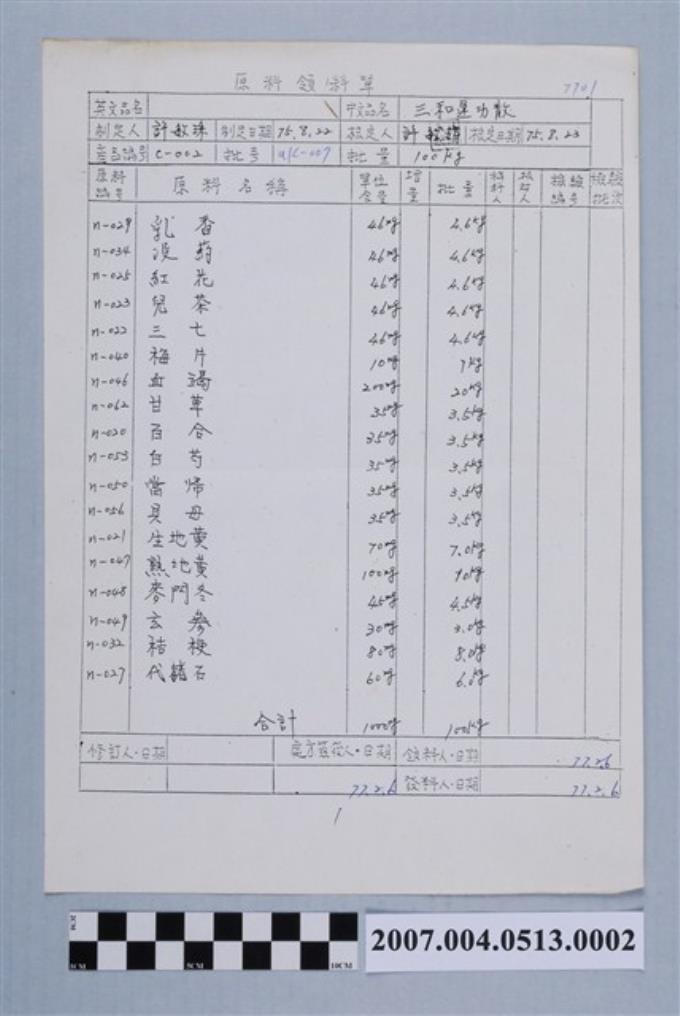 三和運功散原料領料單77年2月6日
