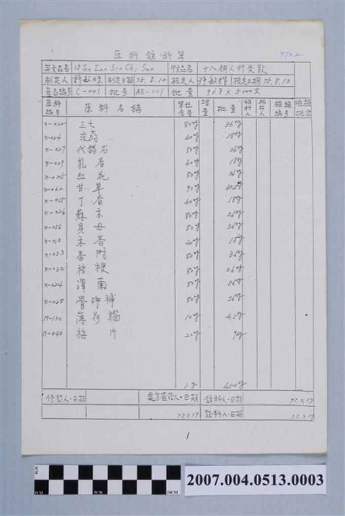 十八銅人行氣散原料領料單77年3月17日