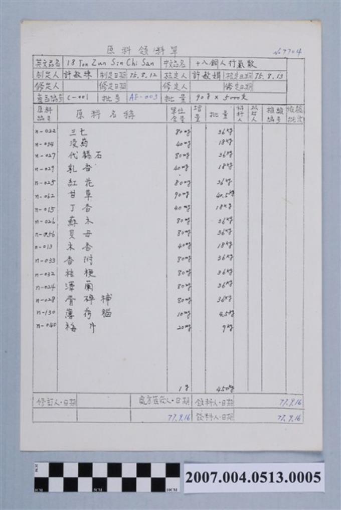 十八銅人行氣散原料領料單77年9月16日