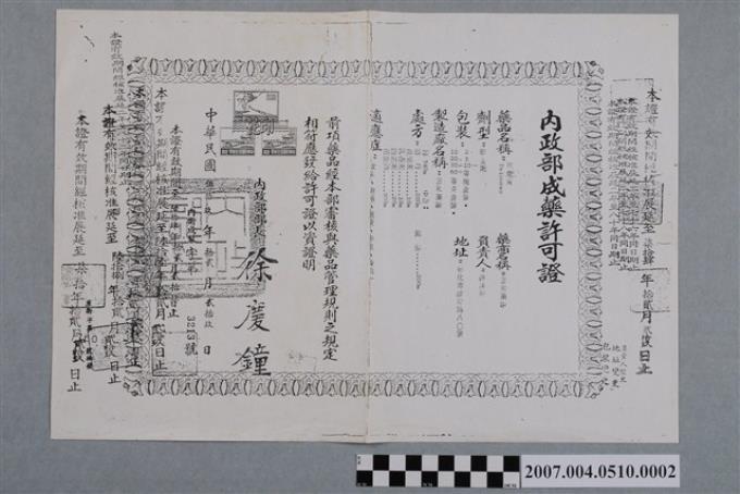 三和藥廠百虎膏內政部成藥許可證影本