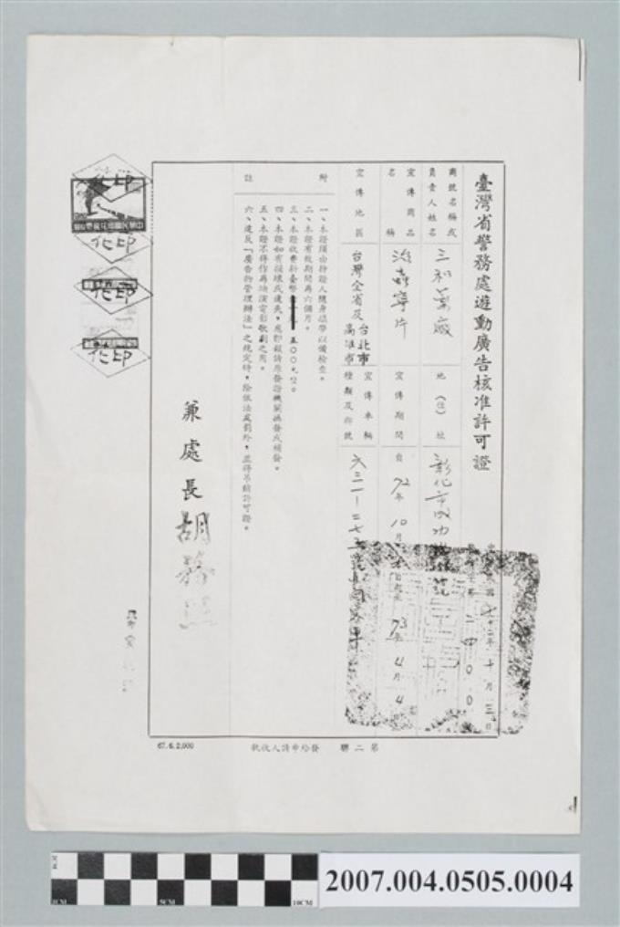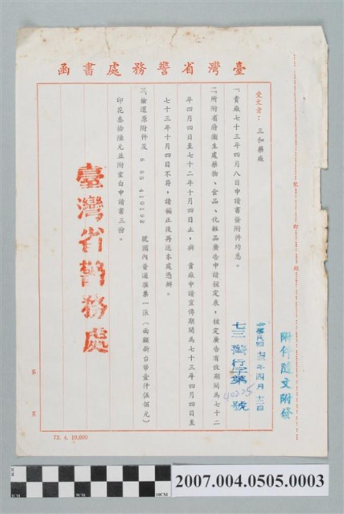 臺灣省政府衛生處致三和藥廠申請展期藥物廣告准予函