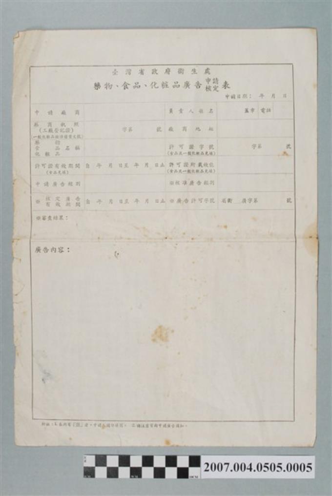 臺灣省政府衛生處藥物食品化粧品廣告申請核定表
