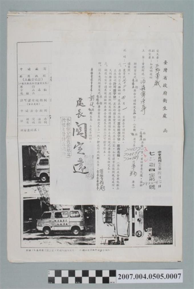 臺灣省政府衛生處致三和藥廠藥物廣告審查完竣函