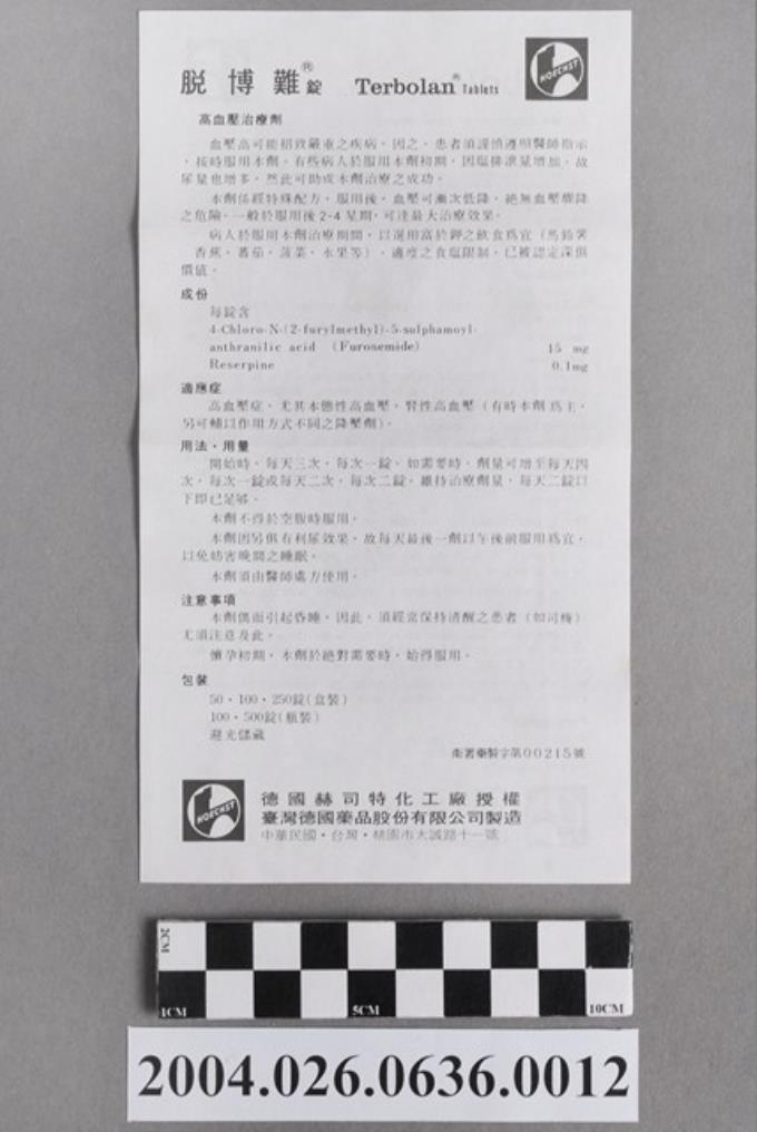 臺灣德國藥品股份有限公司製造抗高血壓劑脫博難錠說明書