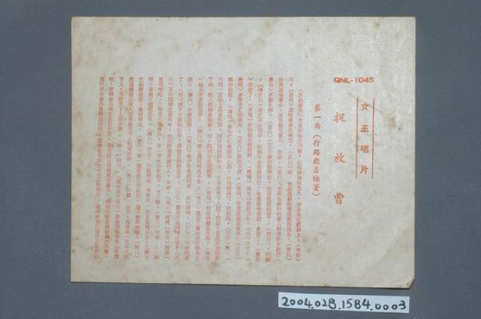 女王唱片公司發行編號「QNL-1045」京劇專輯《捉放曹》唱詞單