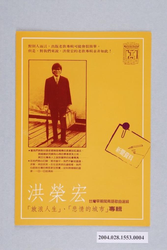 新笛唱片公司發行編號「SRL-004」臺語歌曲專輯《洪榮宏台灣早期閩南語歌曲選輯(一):放浪人生》唱片宣傳單