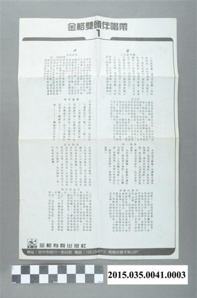 金格有聲出版社發行國語GJ-6014《金格音聲多重伴唱帶11》匣式錄音帶歌詞
